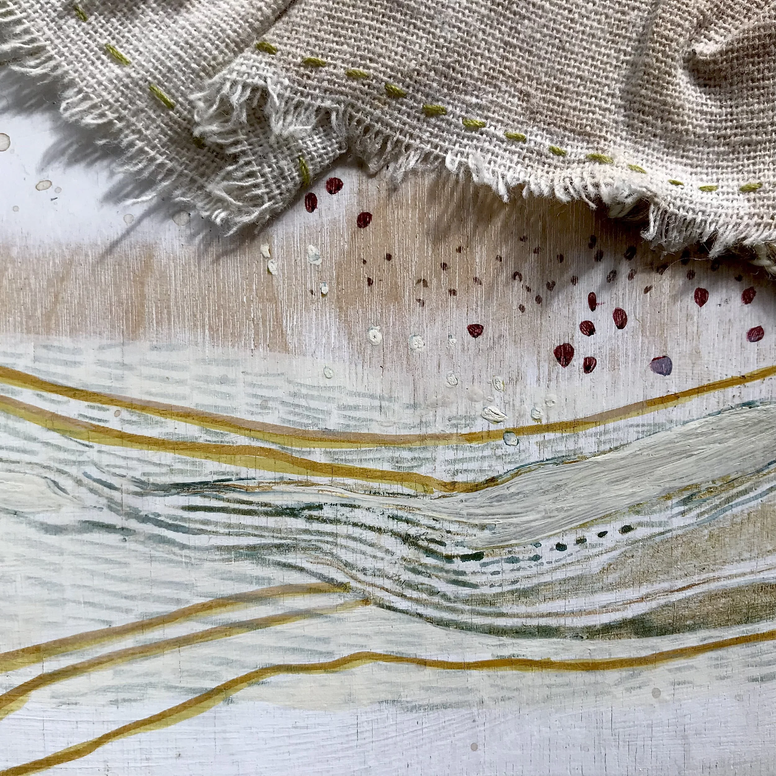 This present mixed media work has been a slow gathering in bits and pieces over the last several years. While they have been in process I have lived in Mississippi, Iowa, Colorado, Texas, and Illinois with two months spent in Missouri and Minnesota as well. These are collections from seasons in the year and seasons in myself. I like to think of them as a sort of palimpsest of marks, images, textures, colors, and materials collected over time from the places I find myself. They are a gradual weaving together -- a kind of web, or nest perhaps.