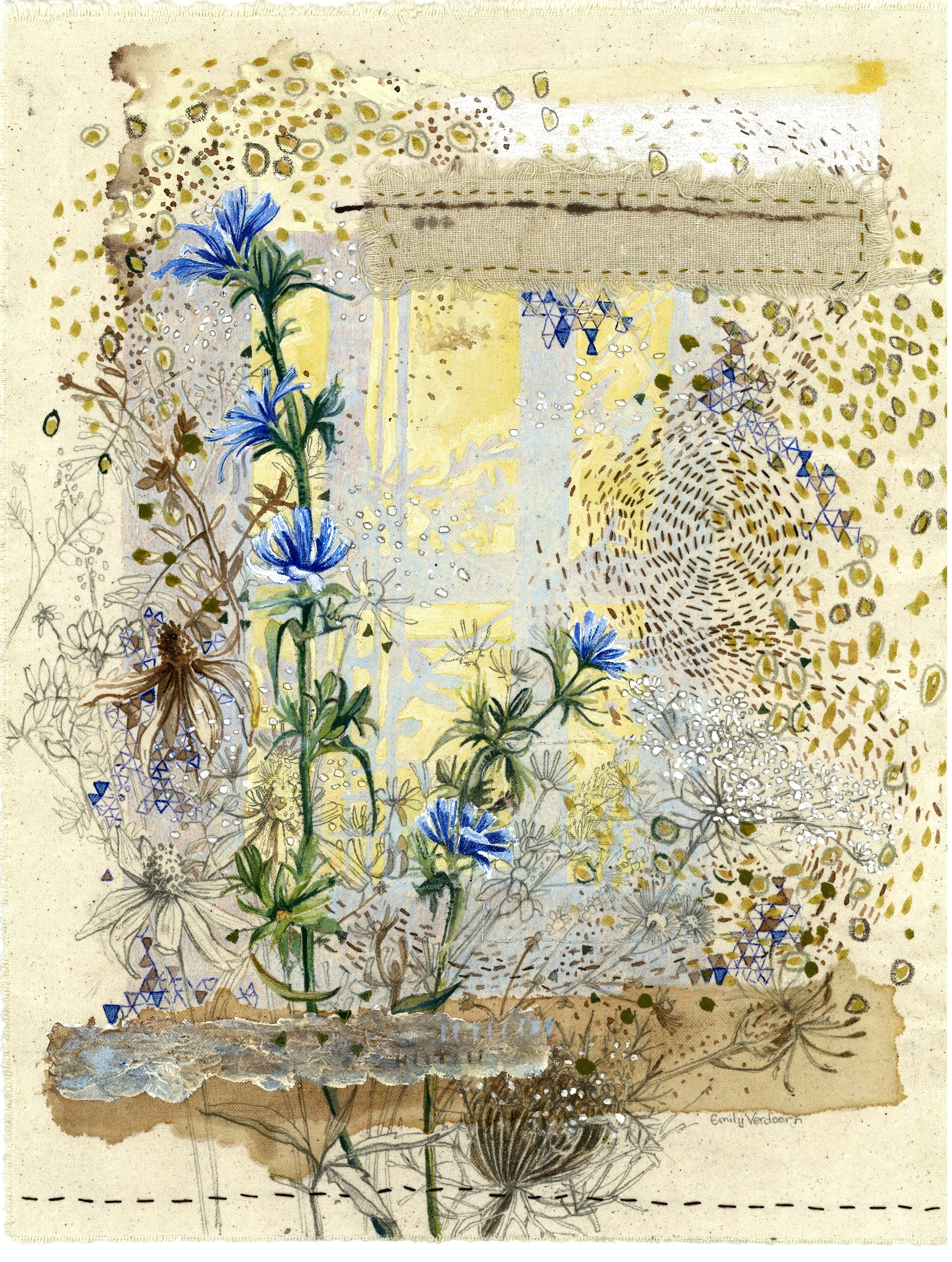 In this work is part of my series titled “tend”. It is responding to the time of year when chicory flowers are in bloom in the roadside ditches, summer is half over but the days are still long and the light coming into living room windows is confident and bright. There is a refraction of light on these days which gives the air a certain intensity. Grasses teem with grasshoppers, bees, gnats, and mosquitoes. Queen Anne’s lace offers a suggestion of Autumn, but is largely drowned out by the buzz and hum of long summer days.